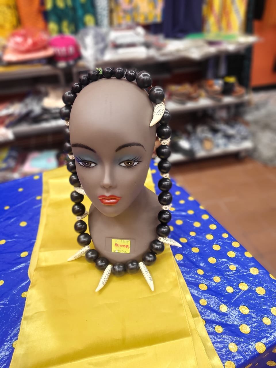 This $100 statement piece is a masterclass in geometric contrast and bold proportions. The strand is primarily composed of oversized, smooth cream-colored block beads, punctuated by small polished ebony spheres that add a rhythmic visual break. The focal point features two sharp, curved ivory-toned tusks that create a powerful, symmetrical silhouette. Hand-finished for a sleek and substantial feel, this necklace is an ideal accessory for those who favor architectural jewelry that makes a strong cultural and modern statement.