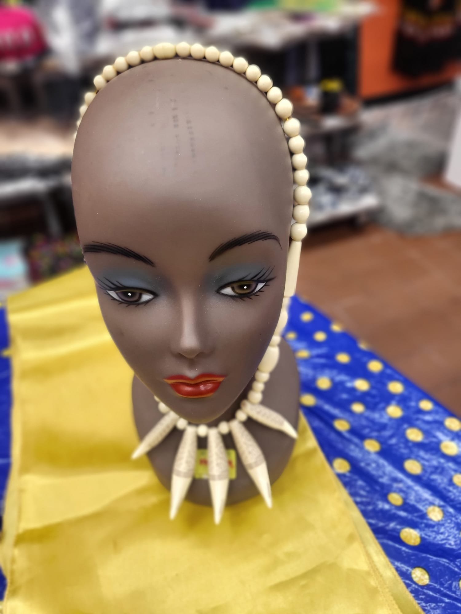 This $70 piece is defined by its artisanal textures and bold contrast. The necklace is crafted from a continuous strand of hand-polished, deep ebony spheres that provide a sleek, comfortable drape. The focal area is adorned with five curved, ivory-toned pendants, each meticulously finished with dark, hand-etched stippling. This “scrimshaw” effect adds a layer of rustic complexity to the smooth beads, making the piece feel like a cherished artifact. It is a perfect balance of traditional tribal silhouettes and detailed hand-craftsmanship.