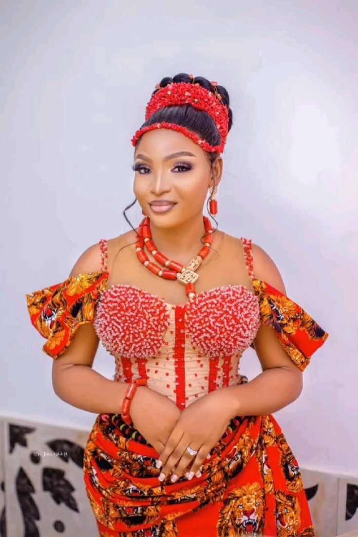 Celebrate your heritage in this vibrant and expertly tailored traditional ensemble. The gown showcases the powerful Isi Agu lion head pattern, perfectly complemented by a nude-illusion bodice heavily embellished with shimmering red and coral beads. The architectural ruffled sleeves add a contemporary flare, making it an exceptional choice for weddings, chieftaincy titles, or prestigious cultural events.