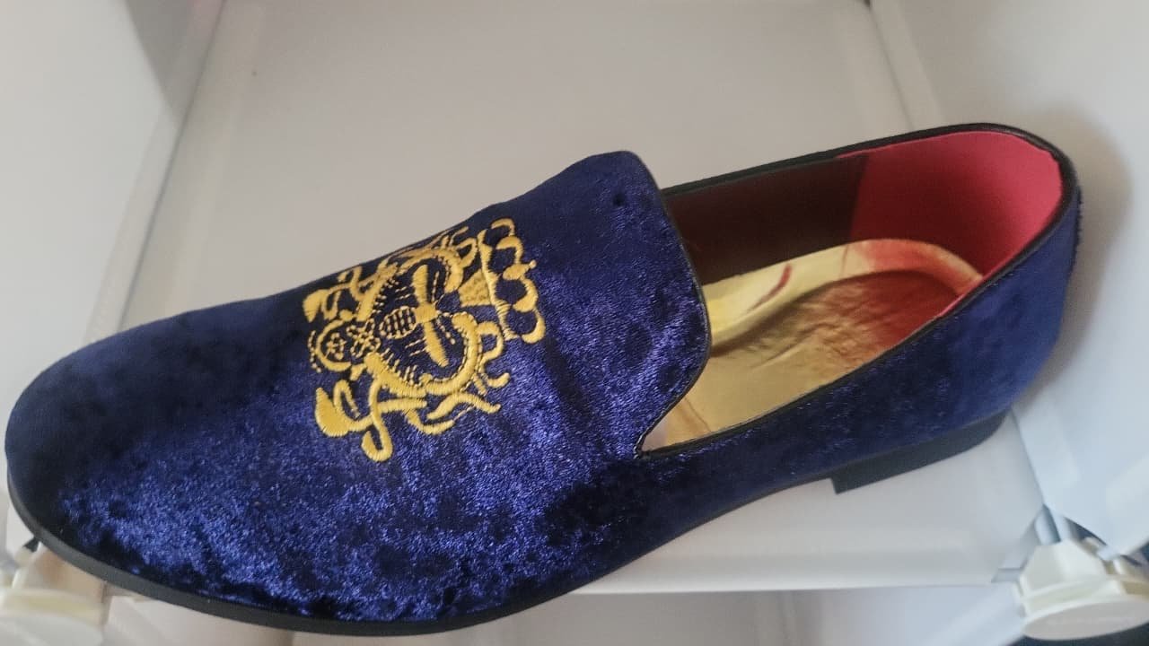 Luxury loafers crafted from premium royal blue crushed velvet, featuring a magnificent gold-threaded ceremonial crest. A sophisticated slip-on designed to provide a regal finish to traditional African attire.
