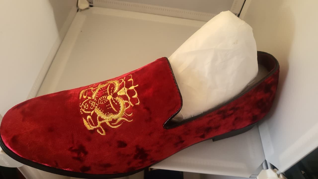 Make a powerful statement with these premium red velvet loafers. The plush, crushed-texture upper provides a sophisticated backdrop for the large, hand-finished gold embroidery on the vamp. Designed with a sleek silhouette and comfortable interior, these shoes are the perfect match for high-status events where you want your footwear to reflect elegance and traditional prestige.