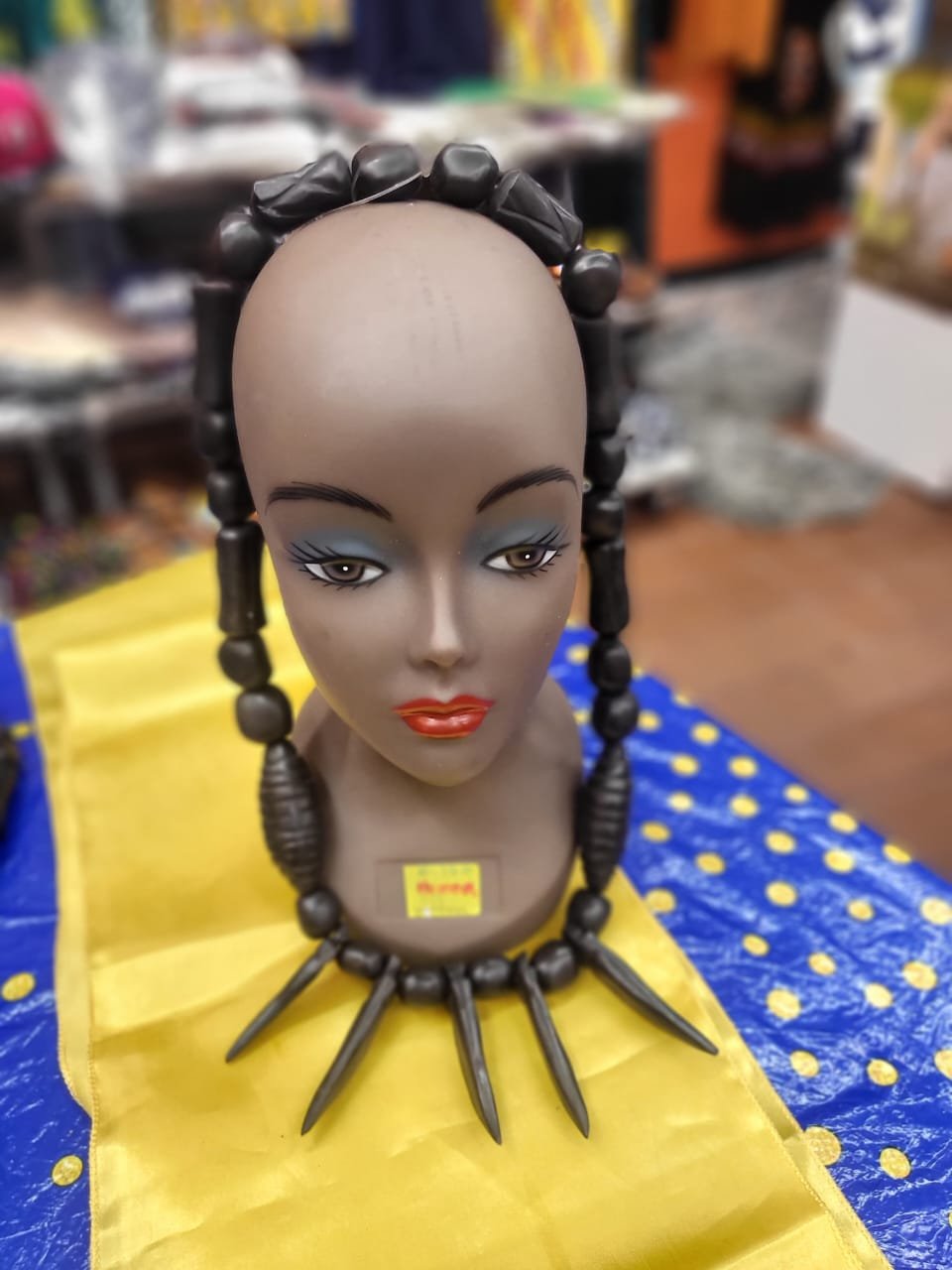 This unique variation of our ebony collection focuses on intricate textural detail. The strand is anchored by five sharp, polished spikes, each separated by distinct cylindrical beads featuring hand-carved horizontal ribs. These textured accents catch the light differently than smooth beads, adding a layer of sophisticated craftsmanship to the monochromatic silhouette. Composed of alternating round and barrel-shaped ebony beads, this $100 piece is a bold, architectural accessory that balances modern edge with artisanal depth.