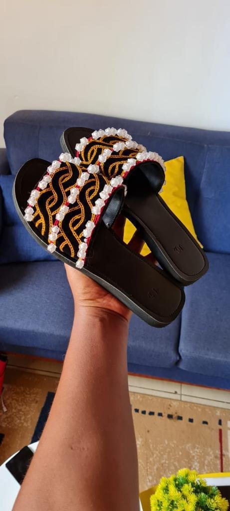 Add a touch of artisanal luxury to your ensemble with these stunning hand-beaded slides. The wide upper strap is crafted from plush black velvet, serving as a rich canvas for the golden geometric “S-curve” embroidery. Each row of stitching is meticulously highlighted by shimmering, faceted beads that catch the light with every step. Designed with a clean, low-profile black sole and a smooth footbed, these sandals offer a refined look without sacrificing ease. These slides are the perfect companion for embroidered kaftans, Ankara prints, or sophisticated loungewear.