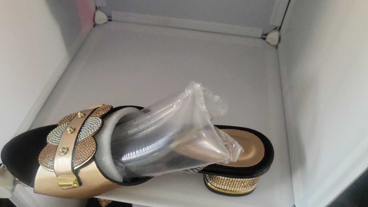 Step into the spotlight with these exquisite women’s statement slides. The metallic rose gold upper serves as a radiant base for two large, overlapping butterfly accents, each meticulously detailed with sparkling crystal embellishments. Designed for both style and stability, the shoe features a unique cylindrical low heel entirely covered in rows of brilliant rhinestones. These slides offer a perfect blend of high-fashion luxury and comfort, making them the ideal choice for weddings, galas, and upscale traditional celebrations.