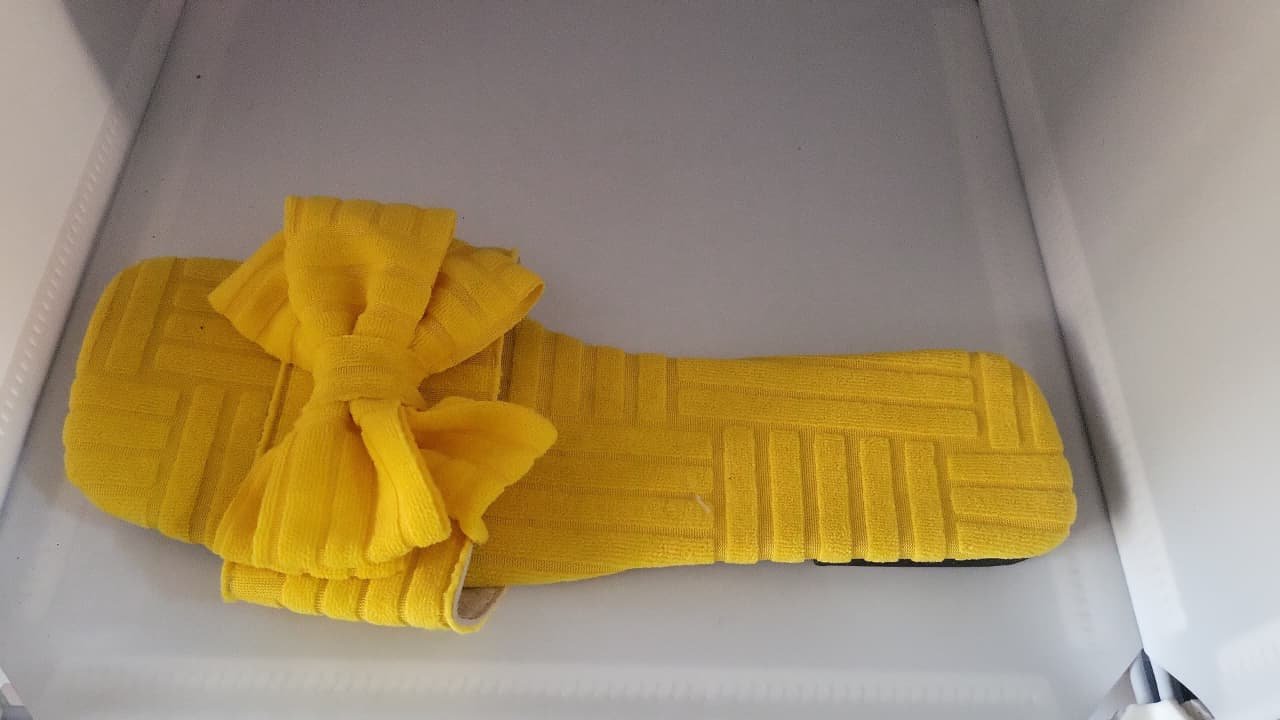 Cheerful mustard yellow slides featuring a plush ribbed fabric texture and a charming oversized bow. A soft and stylish slip-on designed for maximum comfort and a pop of sunny color.